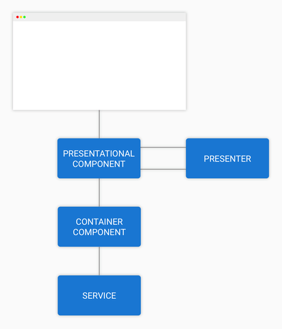 现在,我们的一个组件分成了两个部分,一个是 presentational component,另一个则是 container component, presenter 的功能我们放到在一个服务里面来实现么,这使得组件的逻辑与现实再次细分,使得该显示的只负责显示,而逻辑则与这个负责显示的组件没有一分钱关系。这有助于后续的开发与维护
