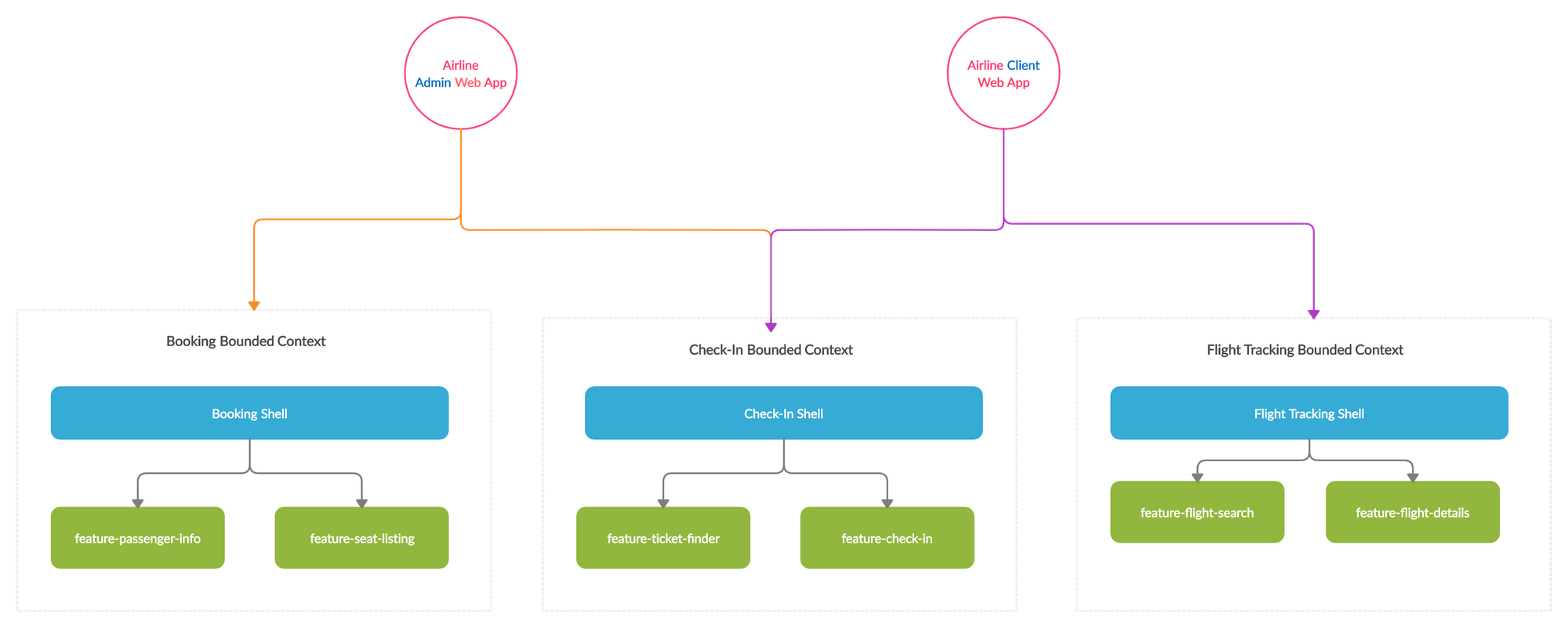 Feature Library 则是包含了许多的用于实现特定功能的密切相关的组件。比如说在 Flight Tracking Bounded Context 中的 feature-flight-search 和 featrue-flight-details ,就分别是用于搜索航班和查看航班详情的功能。